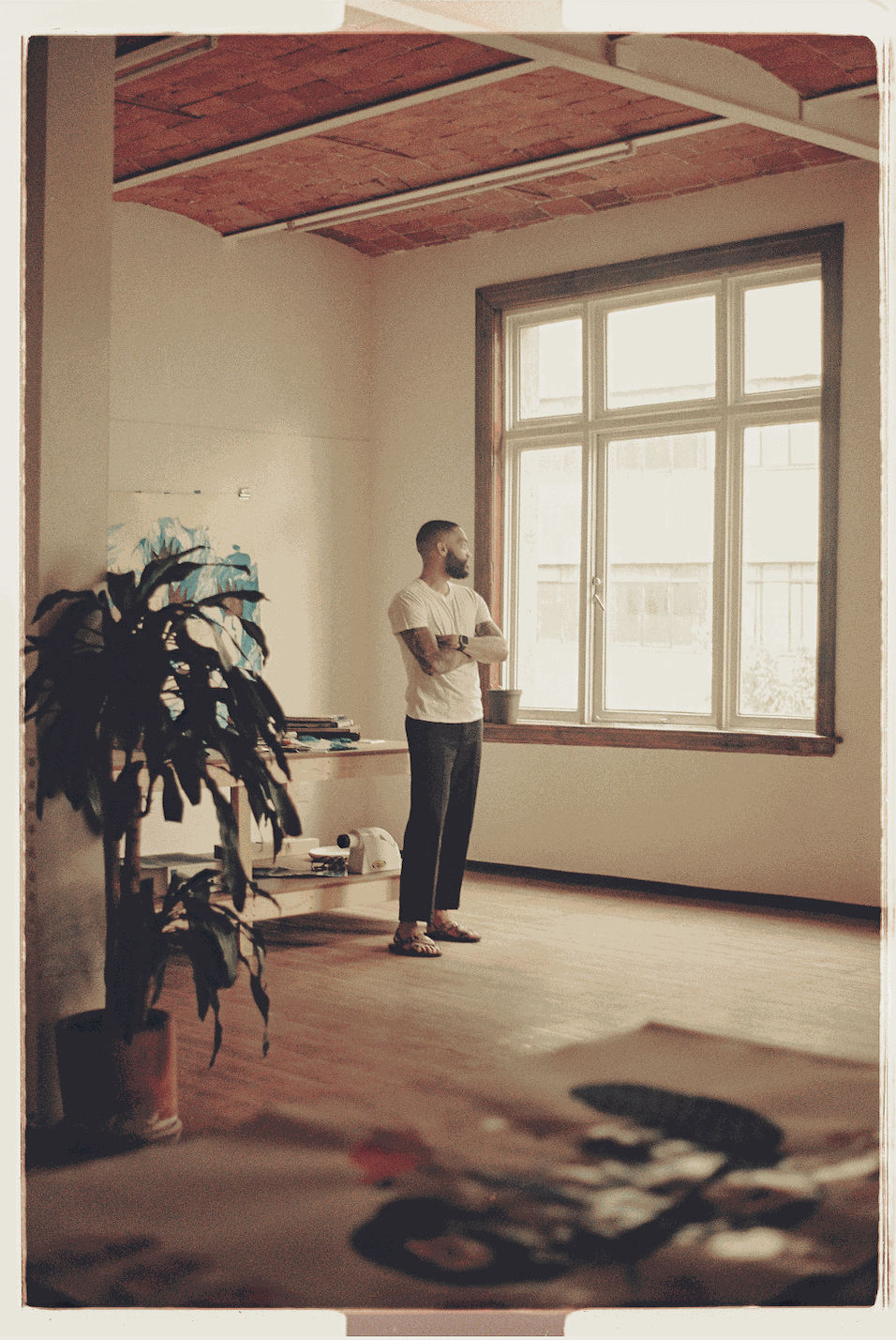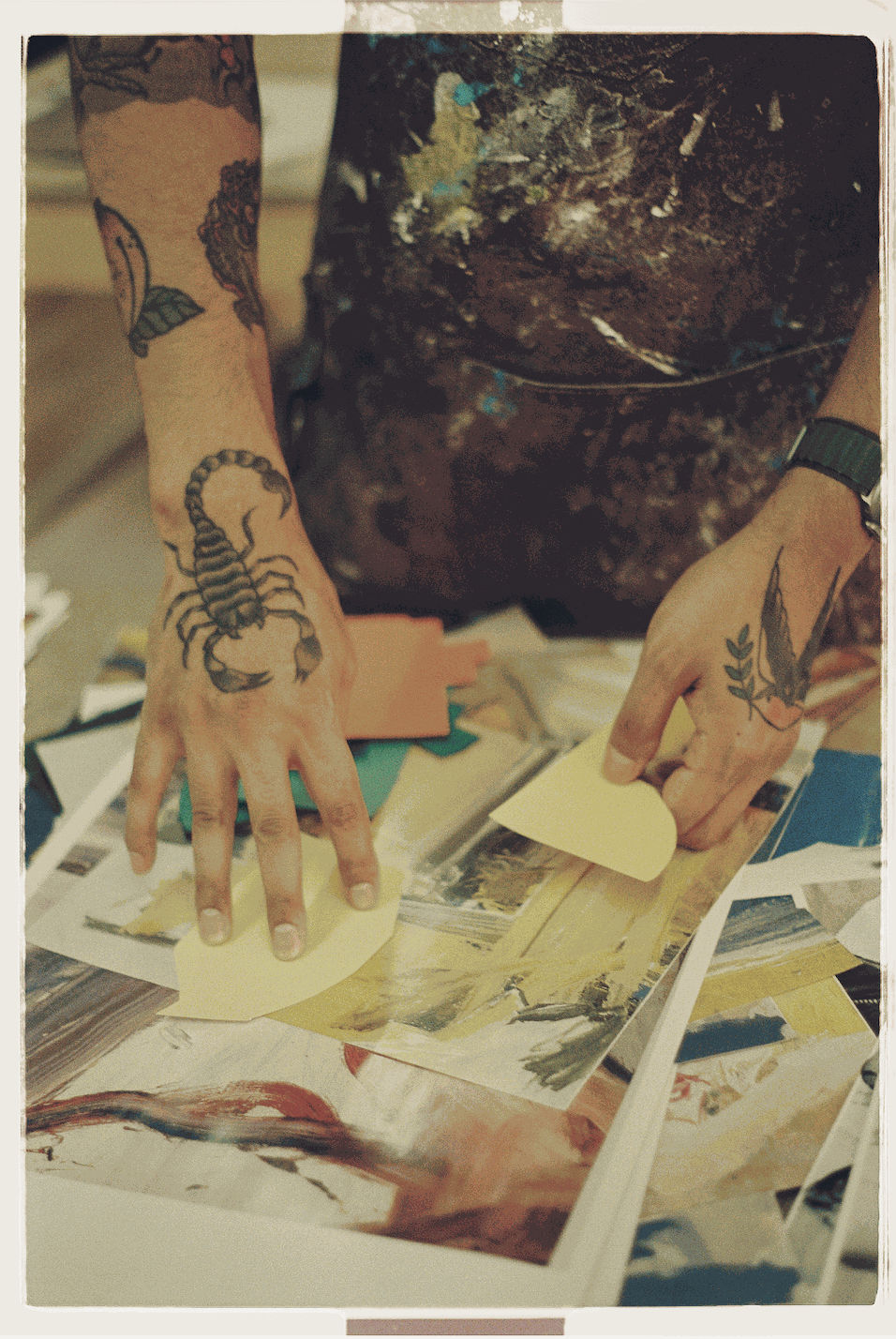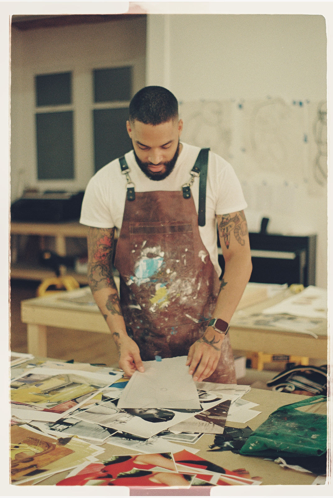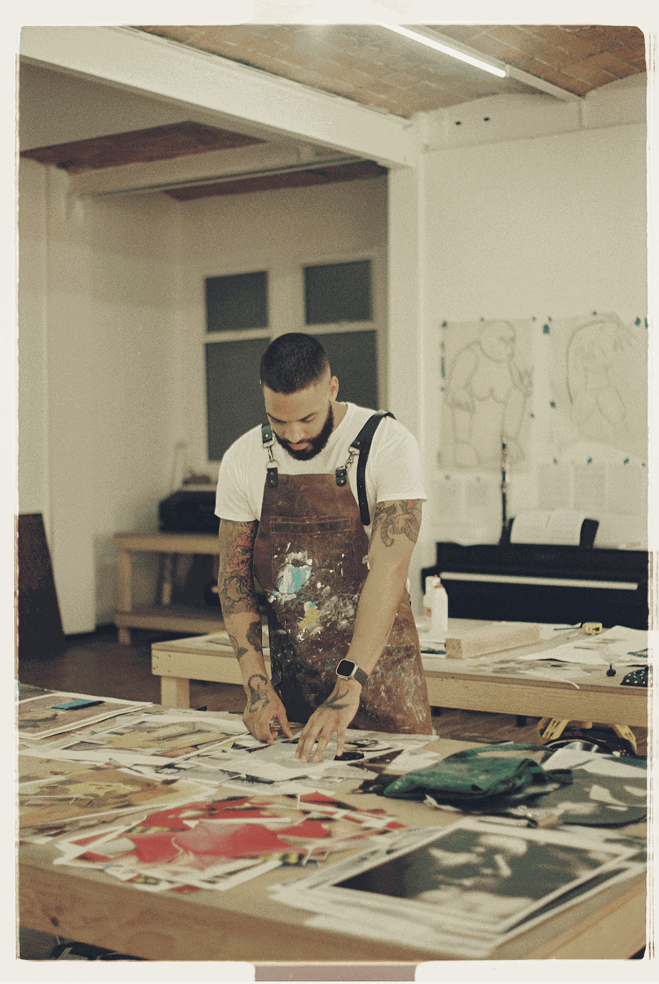 “The studio was filled with magazine cutouts strewn across work tables, boxes of Color-aid paper, small notebooks with sketches for soon-to-be larger works, and charcoal sticks of various sizes.”